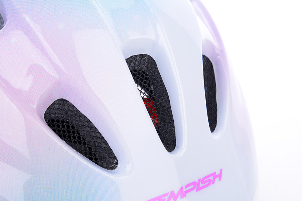 По периметру шлем оборудован вентиляционными отверстиями, чтобы голова ребенка находилась в хорошем климате и не перегревалась. На передней части, в отверстиях, присутствуют сетчатые вставки для защиты от попадания мусора и насекомых.