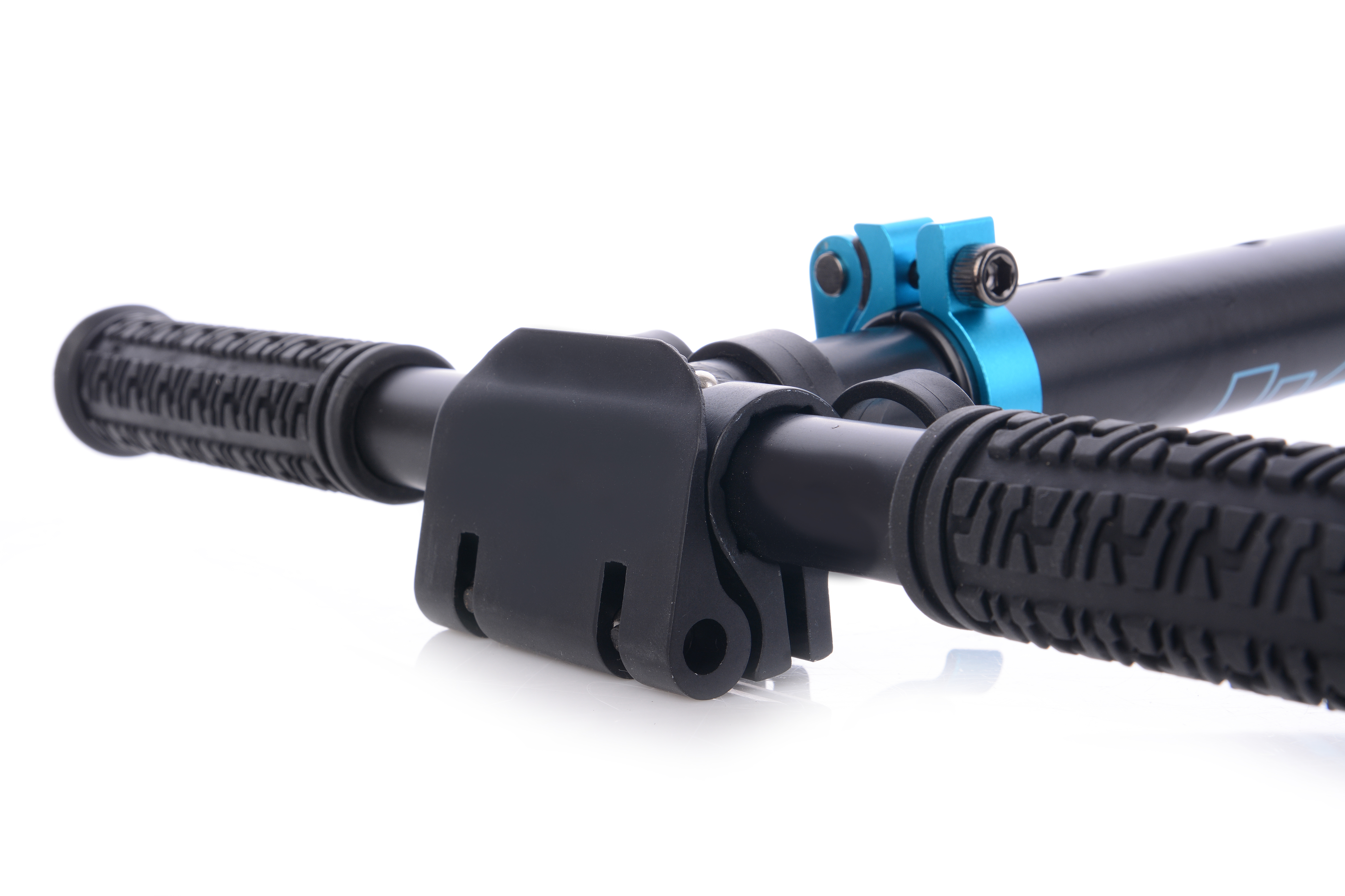 Большой рулевой зажим обеспечивает надежную посадку руля, а бортики на грипсах создают упоры для рук, защищая их от соскальзывания.