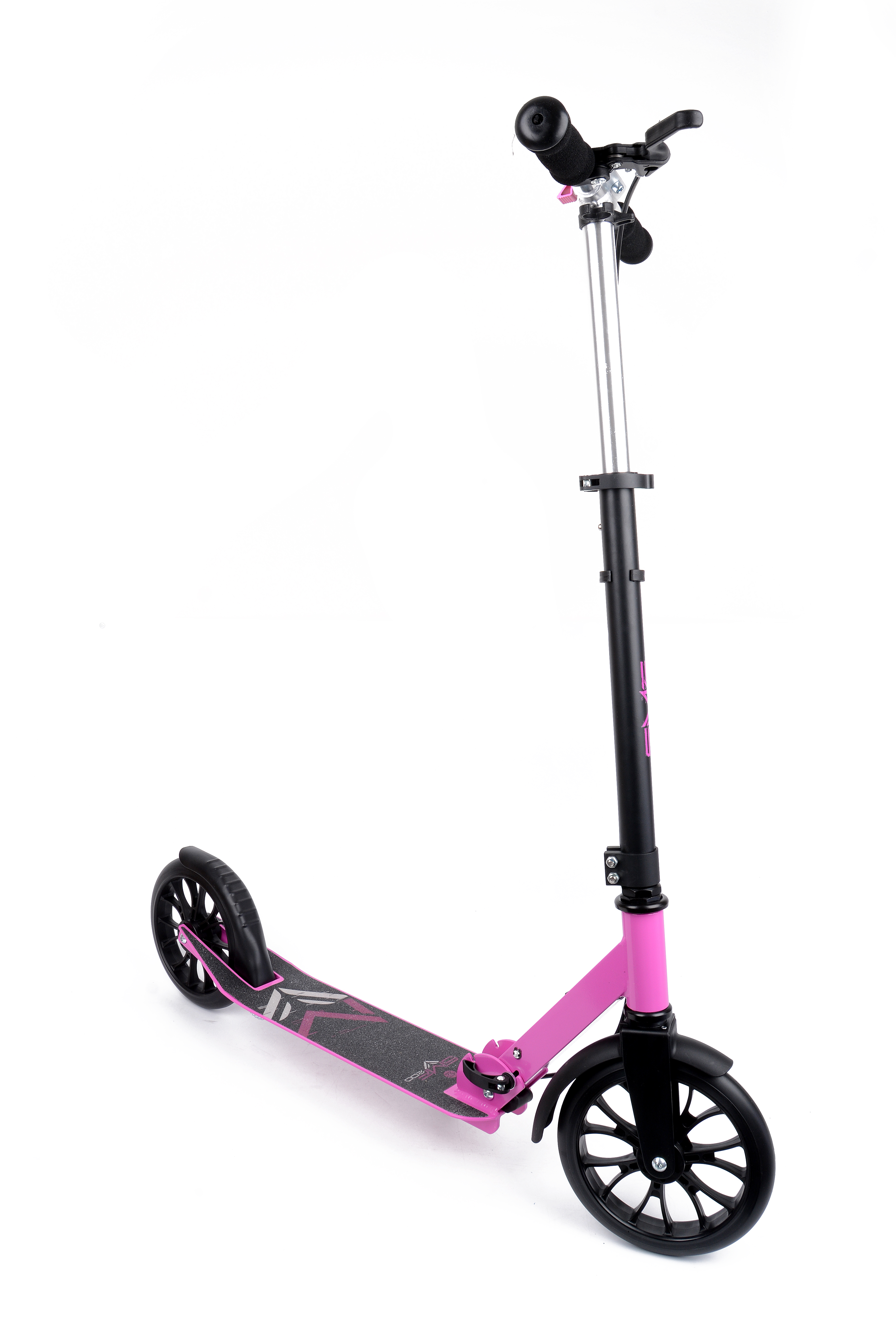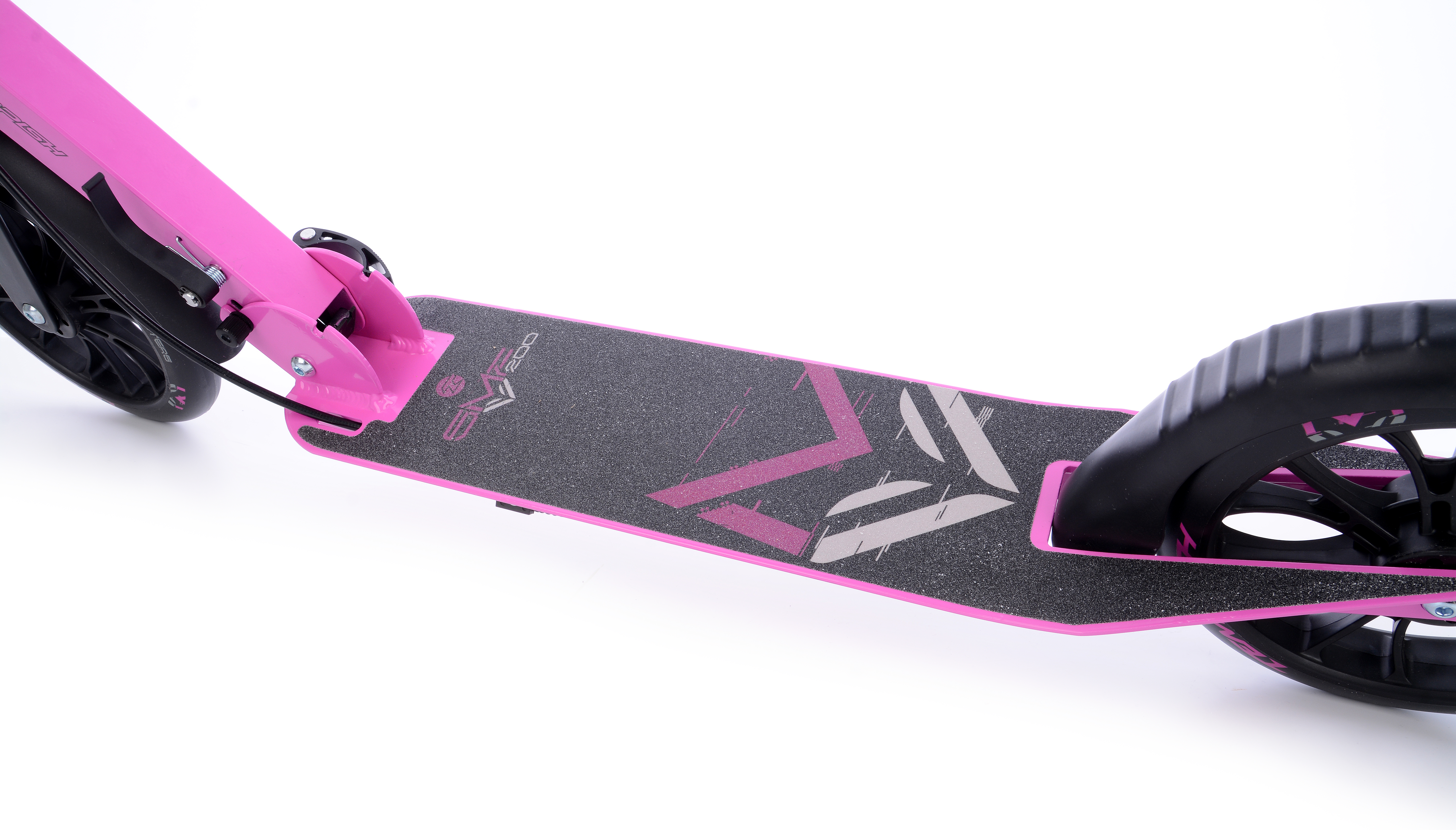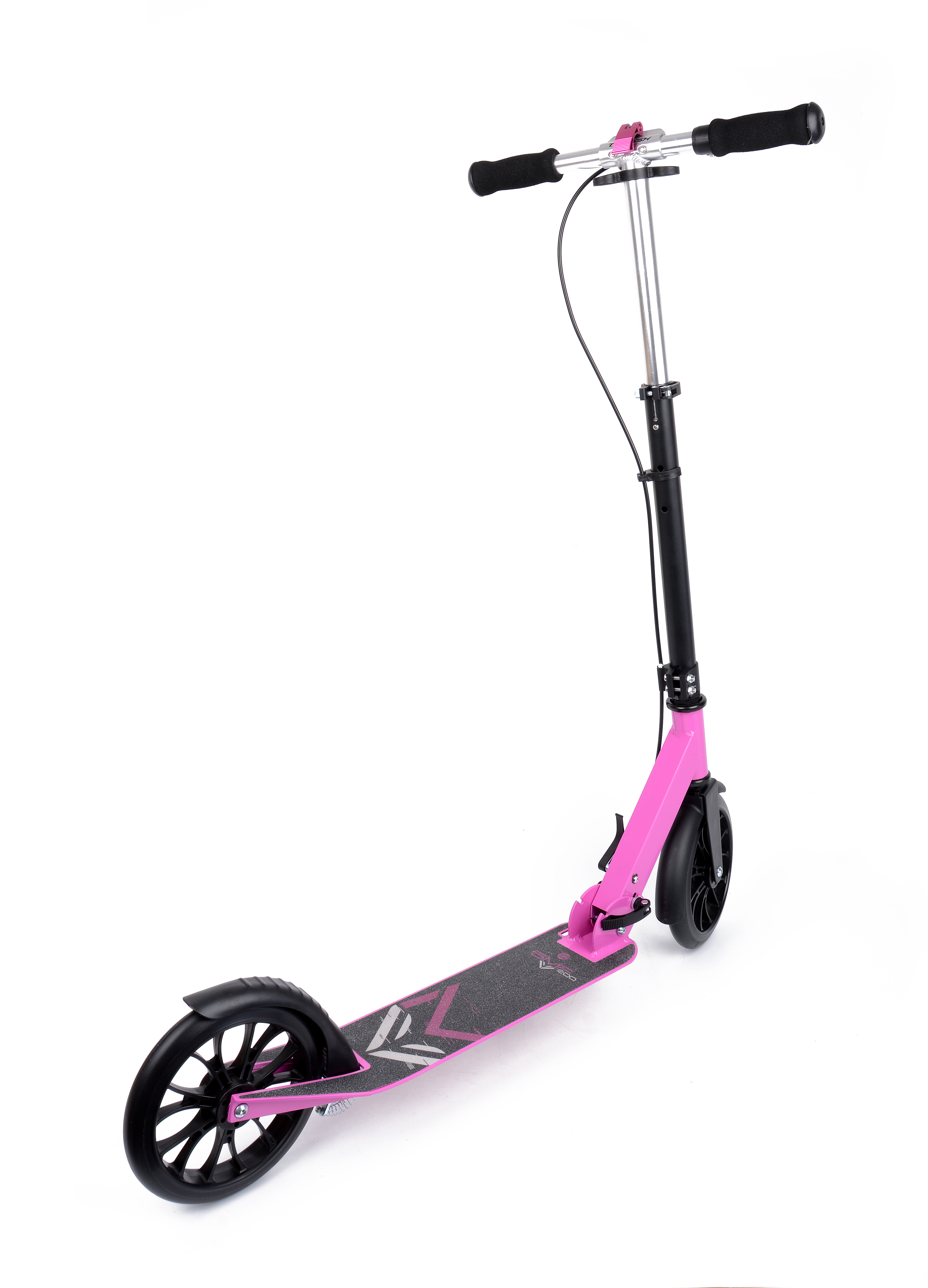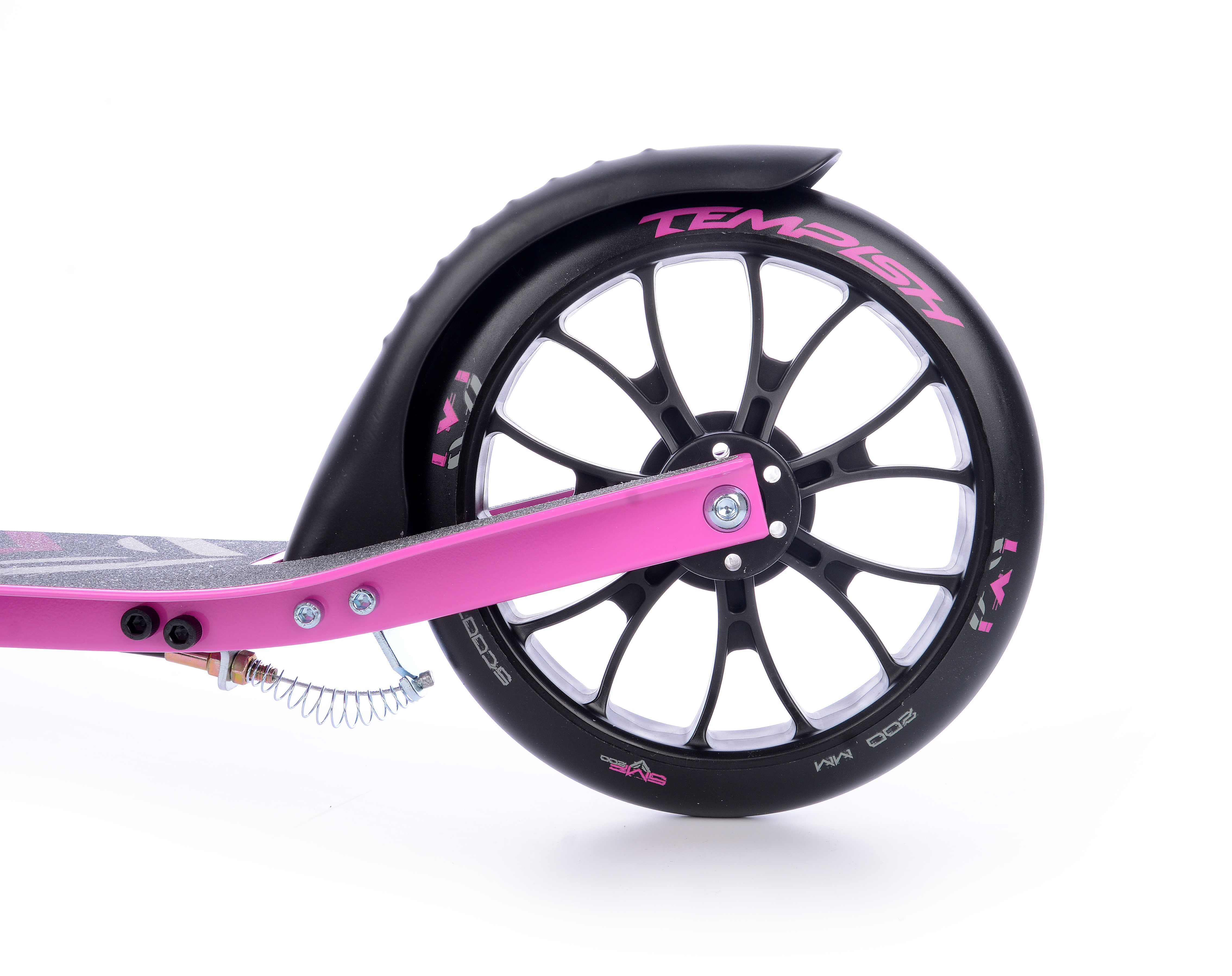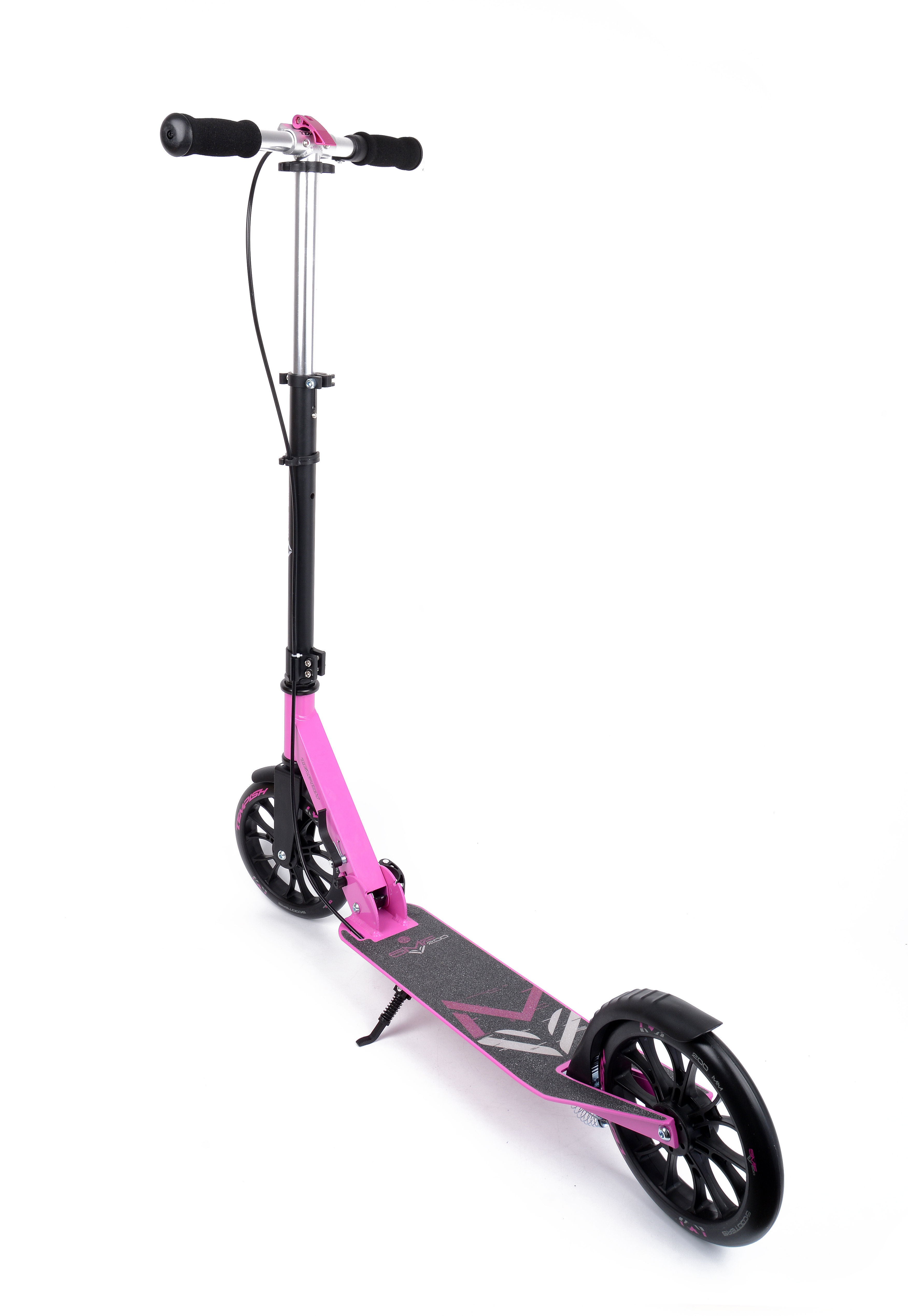 Колеса диаметром 200 мм и шириной 30 мм изготовлены из прочного полиуретана, благодаря чему у них хорошее сцепление с дорожным покрытием, они хорошо сглаживают мелкие неровности и имеют длительный срок службы. Закрыты колеса небольшими крыльями, защищающими вас от брызг с мокрой дороги. Работают колеса на подшипниках класса точности ABEC 5. Это среднеуровневые подшипники, которые устанавливаются на большинство среднеклассовых самокатов, но лишь немного уступают по качеству более прецизионным. Для парковки модель оборудована складной подножкой.