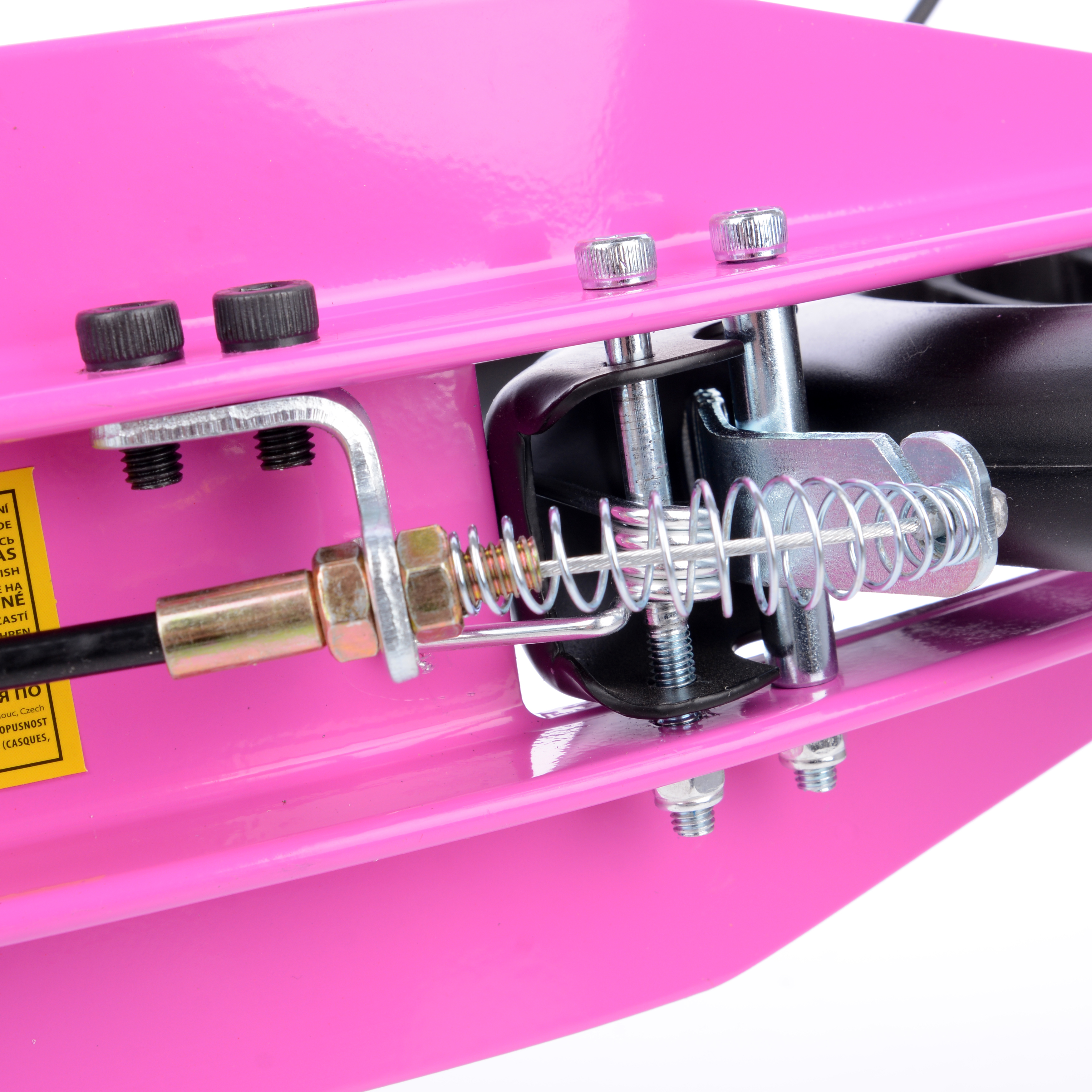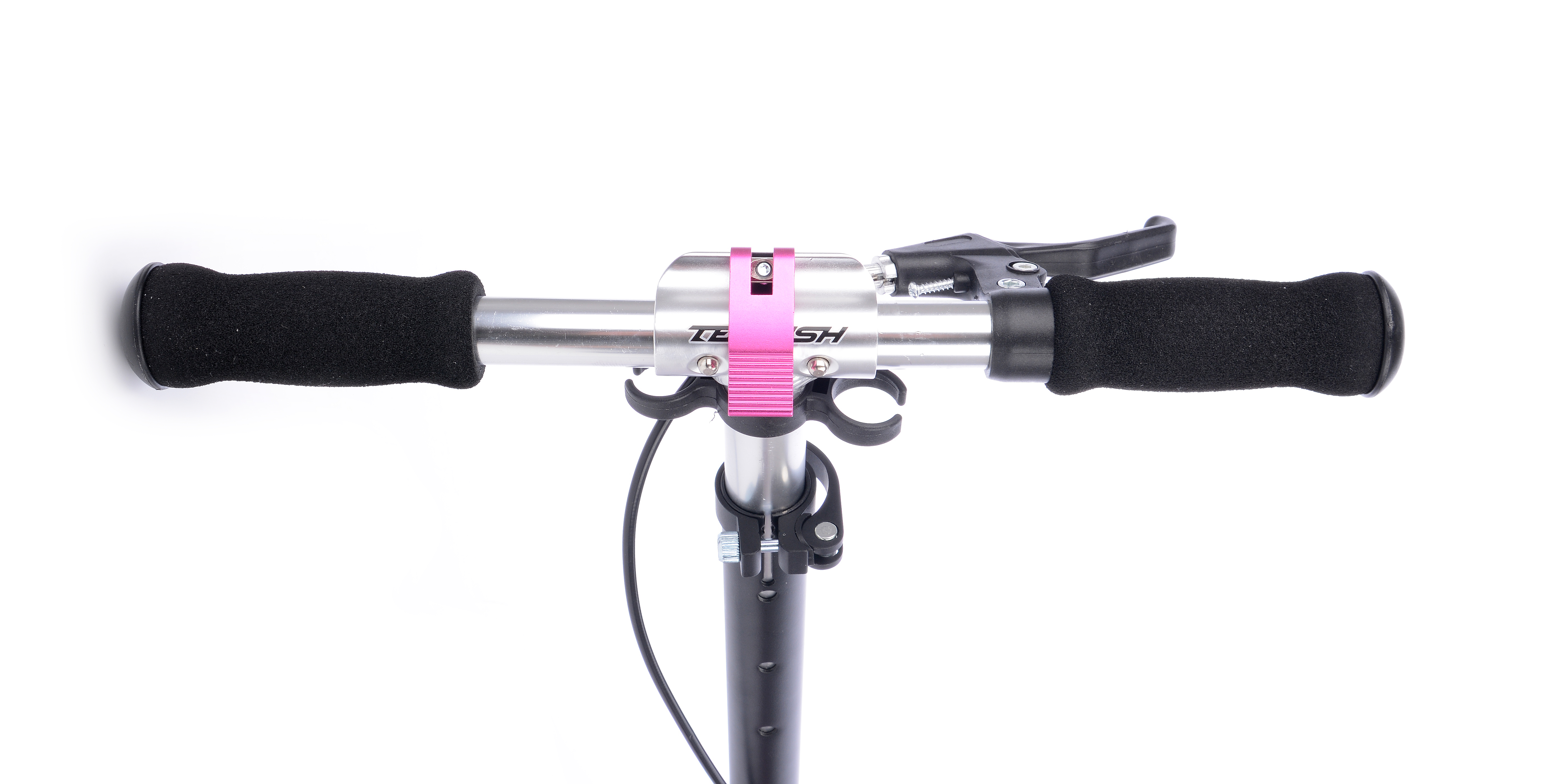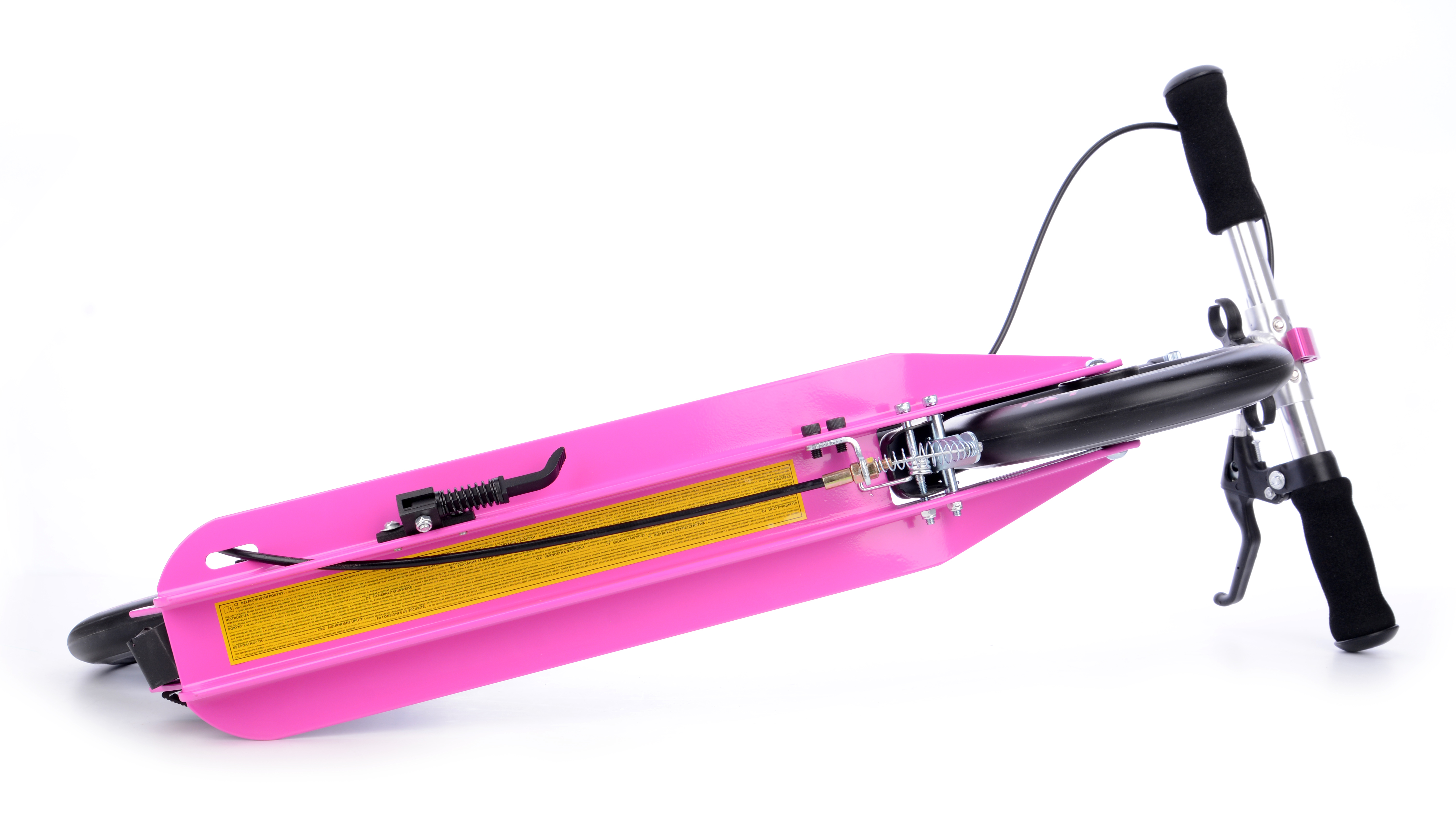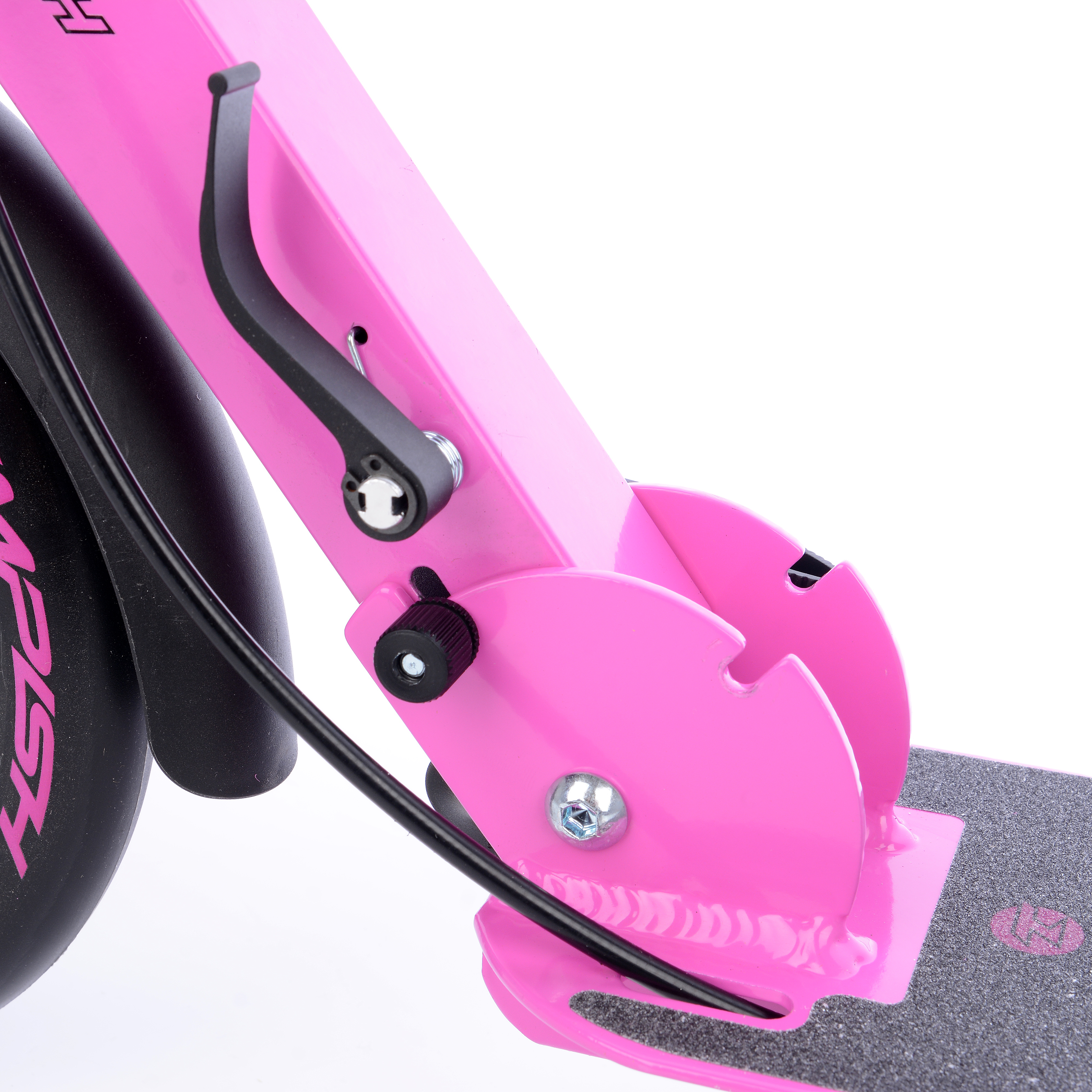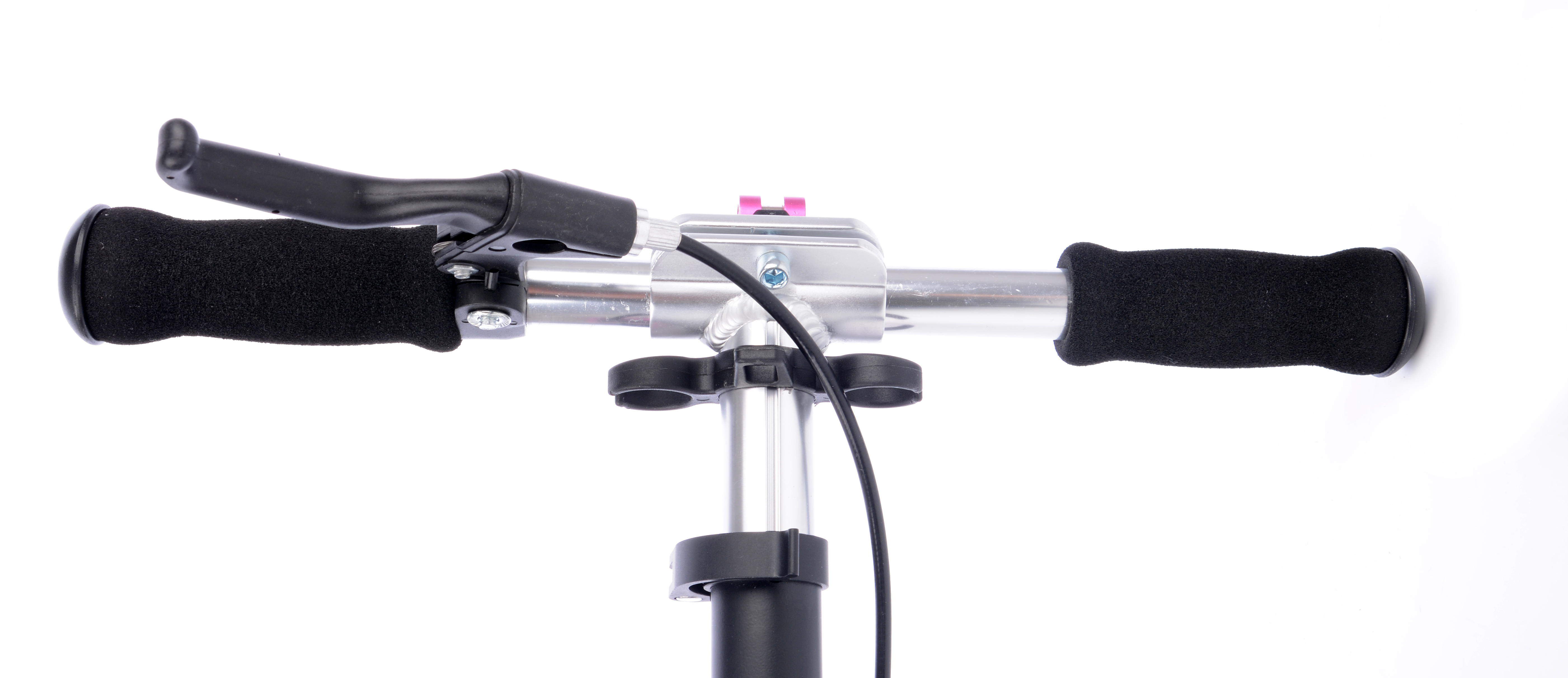 Тормоз заднего колеса приводится в действие с помощью тормозной ручки, расположенной в правой части руля. Работает тормоз за счет механической тяги тросика, по аналогии с велосипедным тормозом, но тормозной колодкой служит заднее крыло. Тормозить можно также нажимая на крыло ногой. За руль комфортно держаться на протяжении всего пути, ведь он оборудован грипсами из мягкого и прочного поролона. Для предотвращения скольжению грипс по рулю, они закреплены специальными фиксаторами.