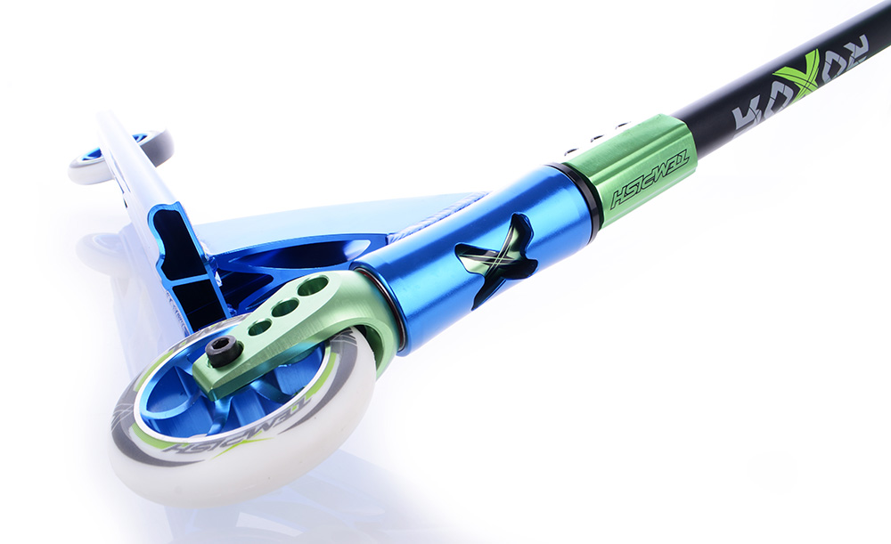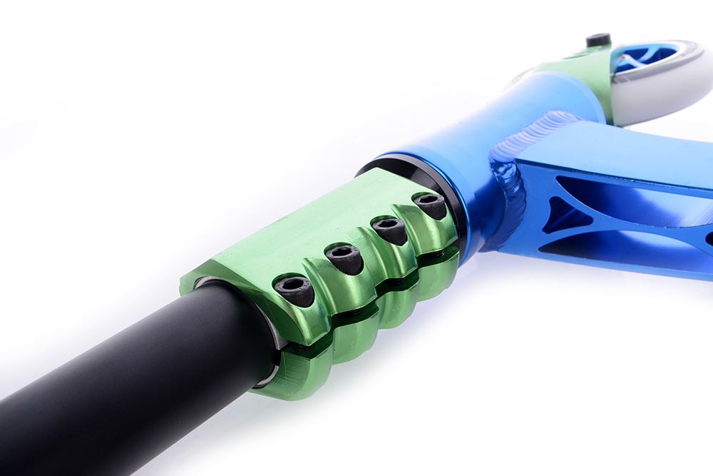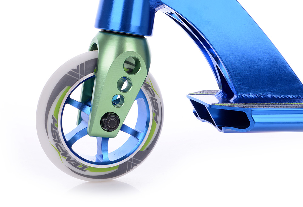 Рулевая, дека и вилка выполнены из высококачественного авиационного алюминия. Хоть такой сплав сложнее поддается обработке, результат такой детали впечатляющий, именно поэтому его используют для формирования запчастей под трюковые комплиты. В результате они получают высокие показатели упругости, текучести и прочности. Вышеперечисленные детали также обработаны на станках с ЧПУ. Такой подход исключает образование трещин после длительных и постоянных нагрузок, как это бывает в запчастях со сварными швами, а также свести к минимуму их вес.