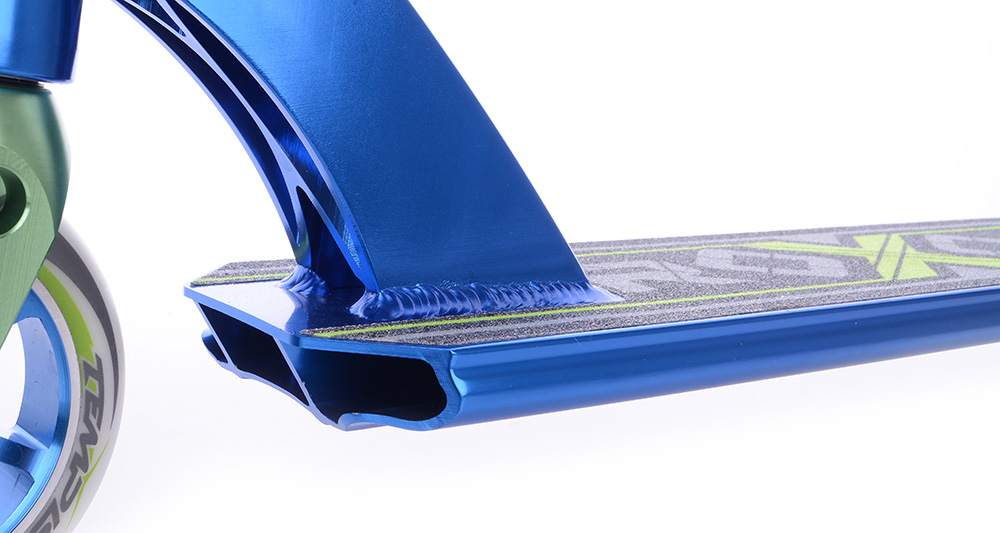 Дека оборудована скошенными лонжеронами, которые делают самокат идеальным для использования в парке, а плоское днище позволяет скользить по препятствиям, как в стритовых комплитах.