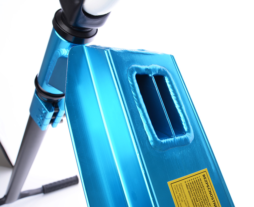 Отличительной чертой самоката является элоксация - это вид химико-термической обработки алюминия, заключающейся в создании защитного слоя оксида алюминия на поверхности металла, что не позволяет ему дальше окисляться, тем самым защищая от коррозии.