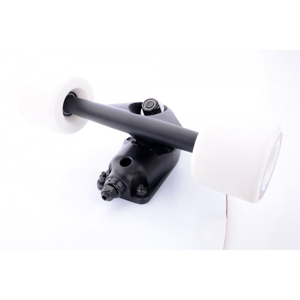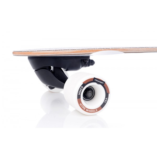 Амортизация подвески достаточно жесткая и идеально подойдет для ровных и быстрых движений. Колеса с мелкозернистой песчаной текстурой имеют жесткость в 78А, чего достаточно для отличного сцепления с дорожным покрытием. Благодаря такому оптимальному показателю, райдера не будет заносить на поворотах не при каких обстоятельствах. Внешне колеса прозрачны и имеют коричневые сердечники, что добавляет стиля.