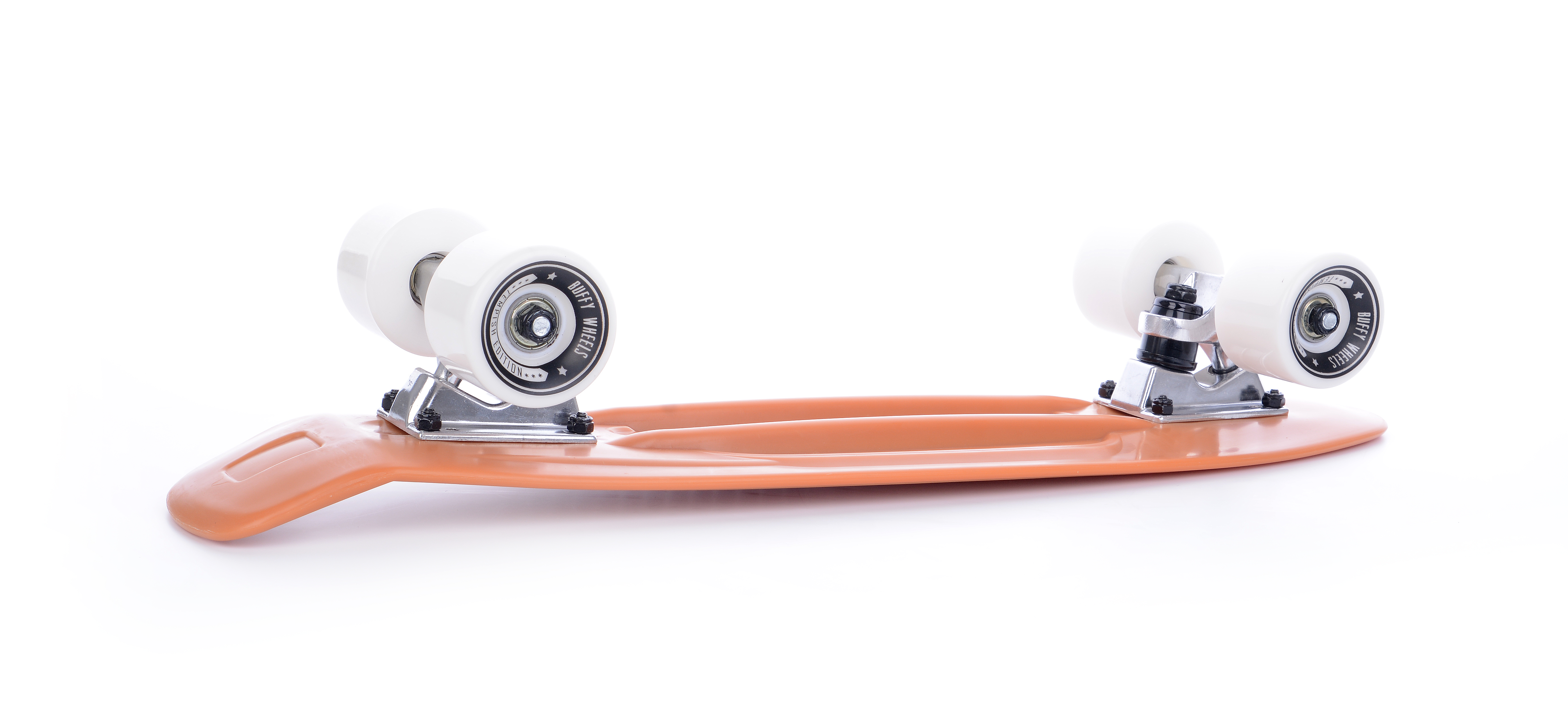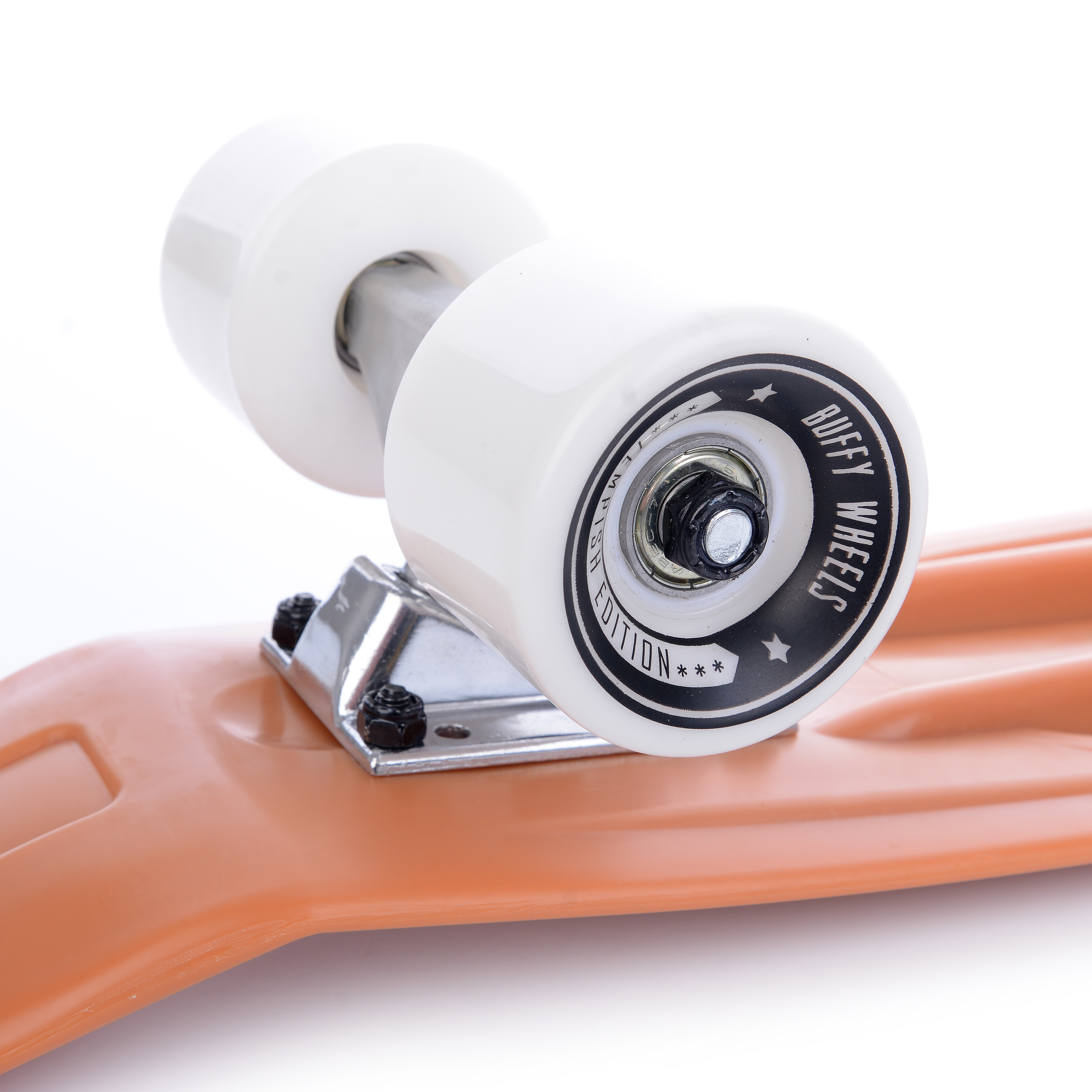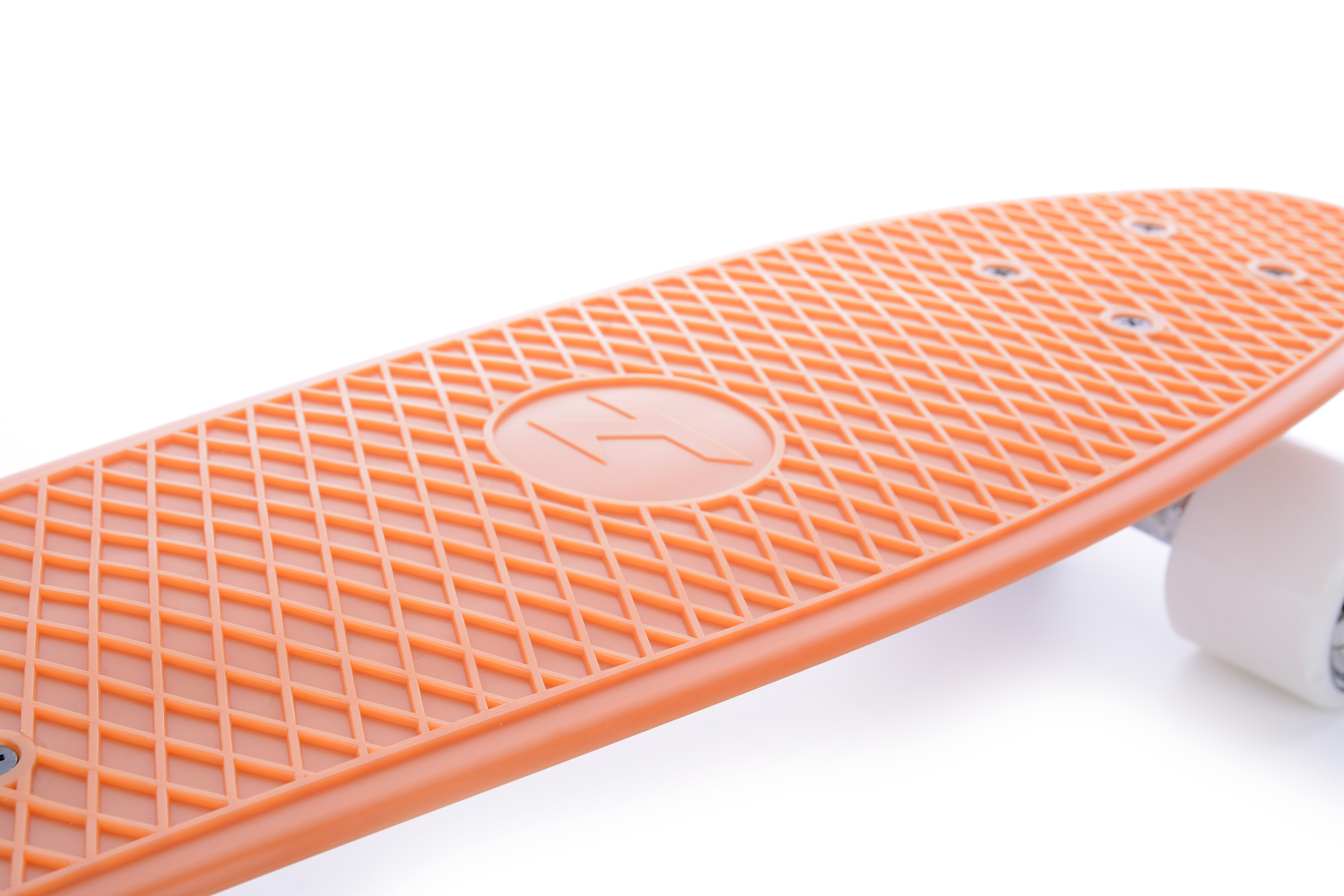 Материалом для деки служит ударопрочный полипропилен, пластинчатый полимер, который обладает высокой прочностью и устойчивостью к растрескиванию. Сам по себе материал более легкий по сравнению с пластмассой. Такая доска отлично гасит вибрации от неровного асфальта, что способствует лучшему управлению. Форма доски - прямая, с киктейлом. Киктейл способствует более резким поворотам и некоторым трюкам. В качестве удерживающего ноги покрытия выступает рифленая структура поверхности деки.