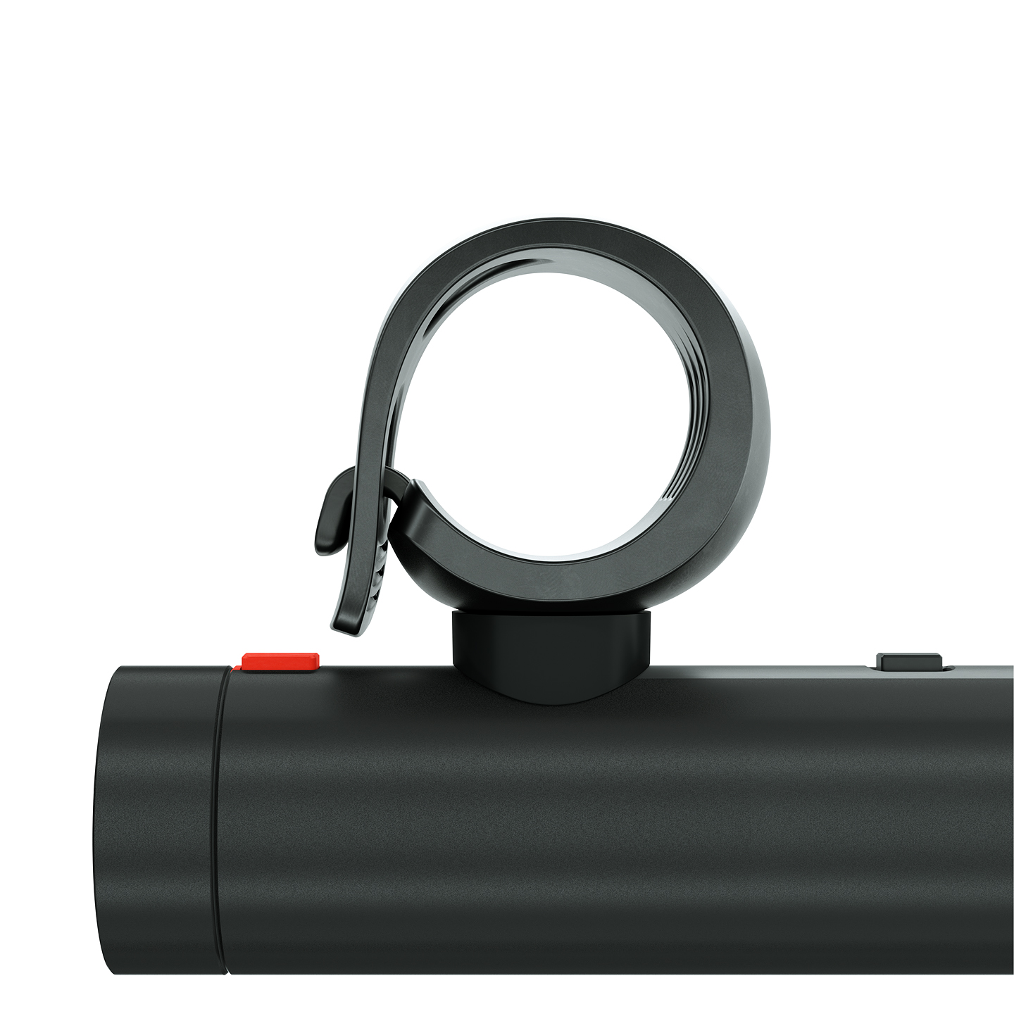 Задняя часть фонаря представляет собой повербанк с USB портом. Нажмите красную кнопку чтобы снять крышку и используйте его для зарядки телефона, GoPro, велокомпьютера или другой портативной электроники. Функция доступна даже при включенном освещении.