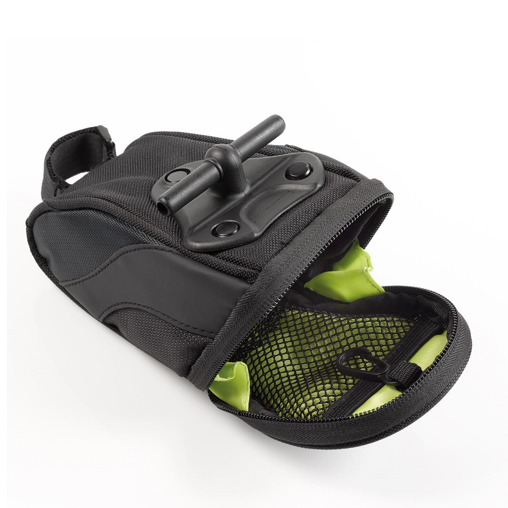 Подседельная сумка прочно фиксируется за счет Т-образной застежки. Внутренняя часть дополнена неоновой зеленой подкладкой, которая сэкономит время на поиски необходимой детали. Сетчатый карман зонирует область хранения. На внешней части расположены светоотражающие элементы и тисненый фирменный логотип. Дополнительно конструкцией предусмотрен крючок и петля на липучке для крепления на подседельном штыре.