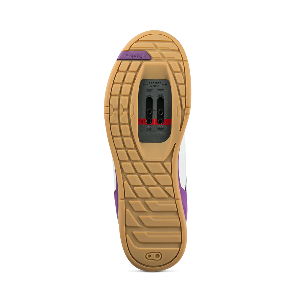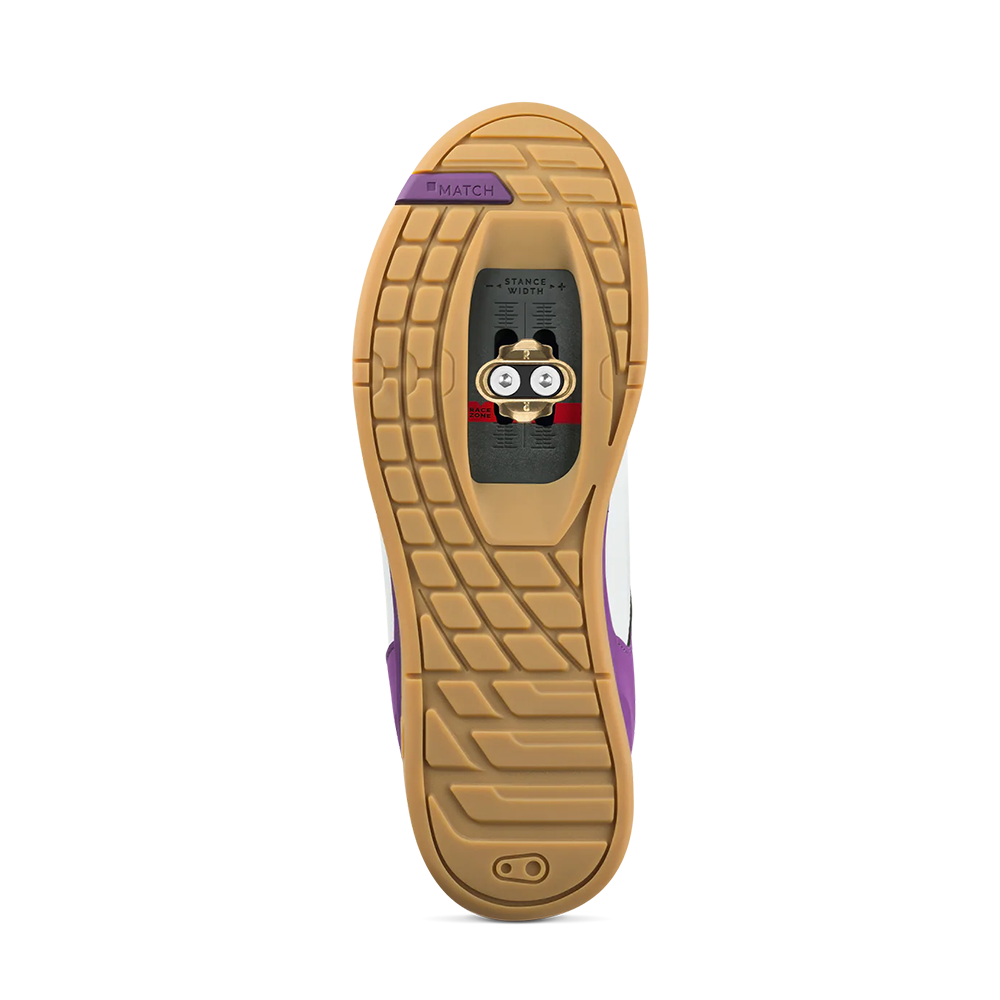 Отлично подходит для гоночной трассы и байк-парка. Инновационная система Match System оптимизирует зацепление для любой системы крепления MTB, будь то Crankbrothers или SPD. Обувь поставляется с прокладкой Match и шипом Crankbrothers, предварительно установленными в нейтральном положении, поэтому готова к езде с педалями Crankbrothers прямо из коробки. Выпускаемая в ограниченном количестве, фирменная обувь Bernard Kerr Mallet Lace отличается ретро-фиолетовым и белым верхом в сочетании с натуральной резиновой подошвой, а также предустановленными белыми шнурками и запасным набором фиолетовых шнурков в коробке.