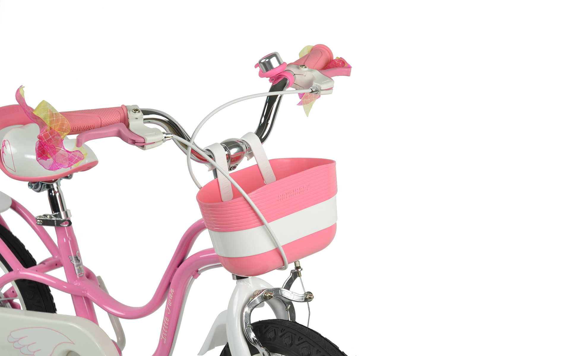 - Вместительная корзина крепится к рулю. Она также оформлена в бело-розовых тонах и предоставляет достаточно пространства, чтобы перевозить с собой любимую игрушку, легкий перекус и бутылочку воды;