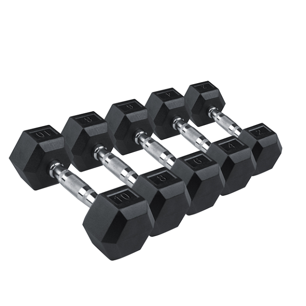 Шестигранные прорезиненные гантели имеют обрезиненные диски, минимизирующие звук, а также повреждения оборудования и пола.