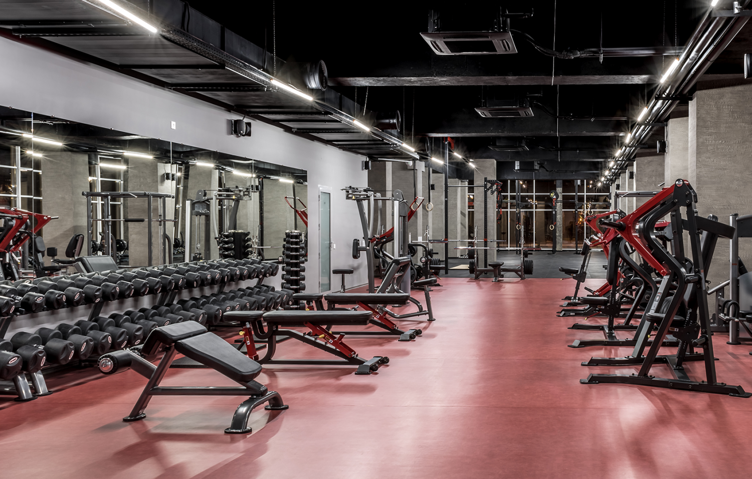 Широкий выбор фитнес-станций, грузоблочных тренажеров и тренажеров на свободном весе, скамеек для тяги и жима, а также гантелей и штанг удовлетворит самых претензионных клиентов.
