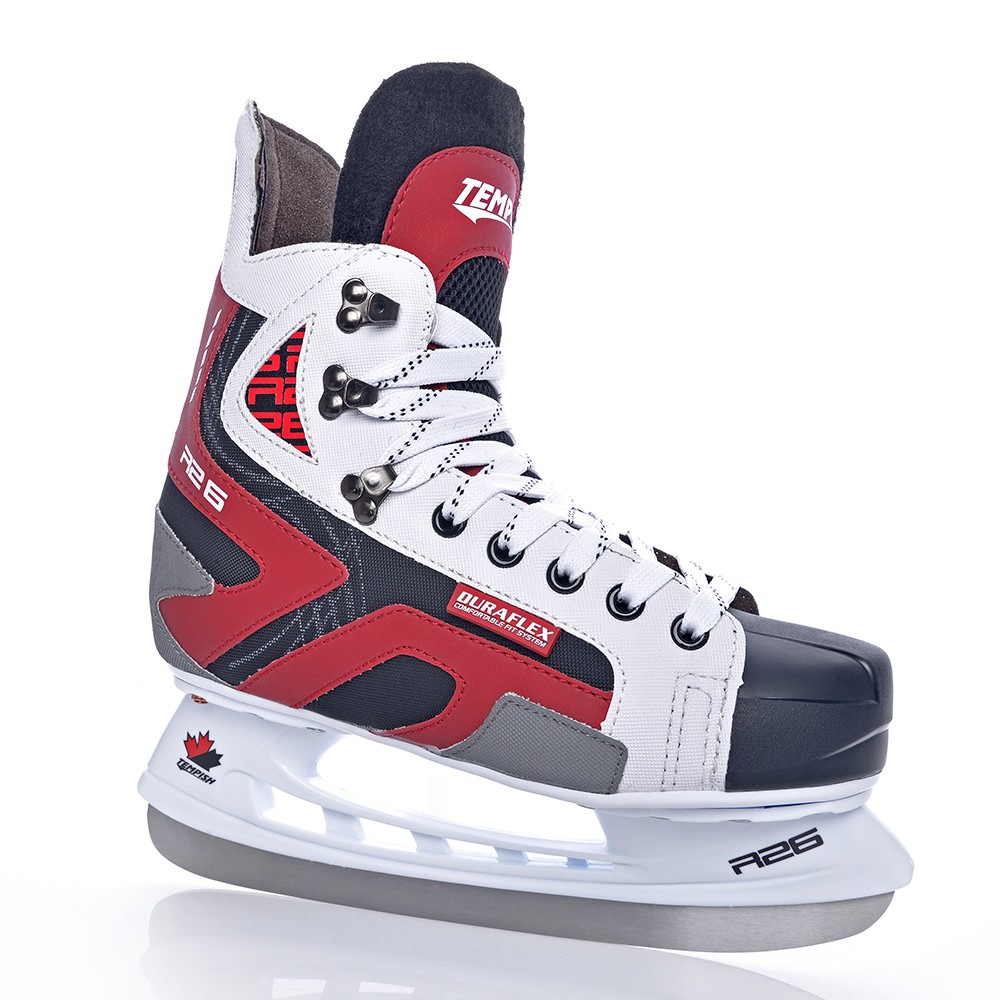 Tempish RENTAL R26 - чоловічі ковзани призначені для прокату. Маркування розміру на п'яті спрощує звернення і прискорює роботу орендного персоналу! Сталеві гачки дозволяють швидко знімати і надягати взуття, а посилені кільцями отвори для шнурівки захищають від стирання шнурки і м'які матеріали черевика.