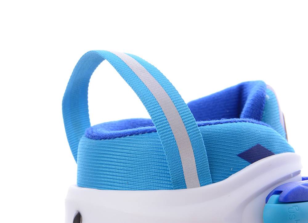 Регулювання розміру дуже зручна завдяки простій системі натискної кнопки. Середньо-висока будова черевика дозволяє манжети щільно підтримувати ногу дитини вище щиколотки. Легкий черевик виготовлений з міцного нейлону і поліпропілену, а розсувна внутрішня частина черевика (лайнер) з міцного анатомічного NYLEX і нейлону, укріпленого вставками з полівінілхлориду. Шнурівка черевика укріплена ремінцем-липучкою, а також двосторонньою застібкою AUTO LOCK для надійності.