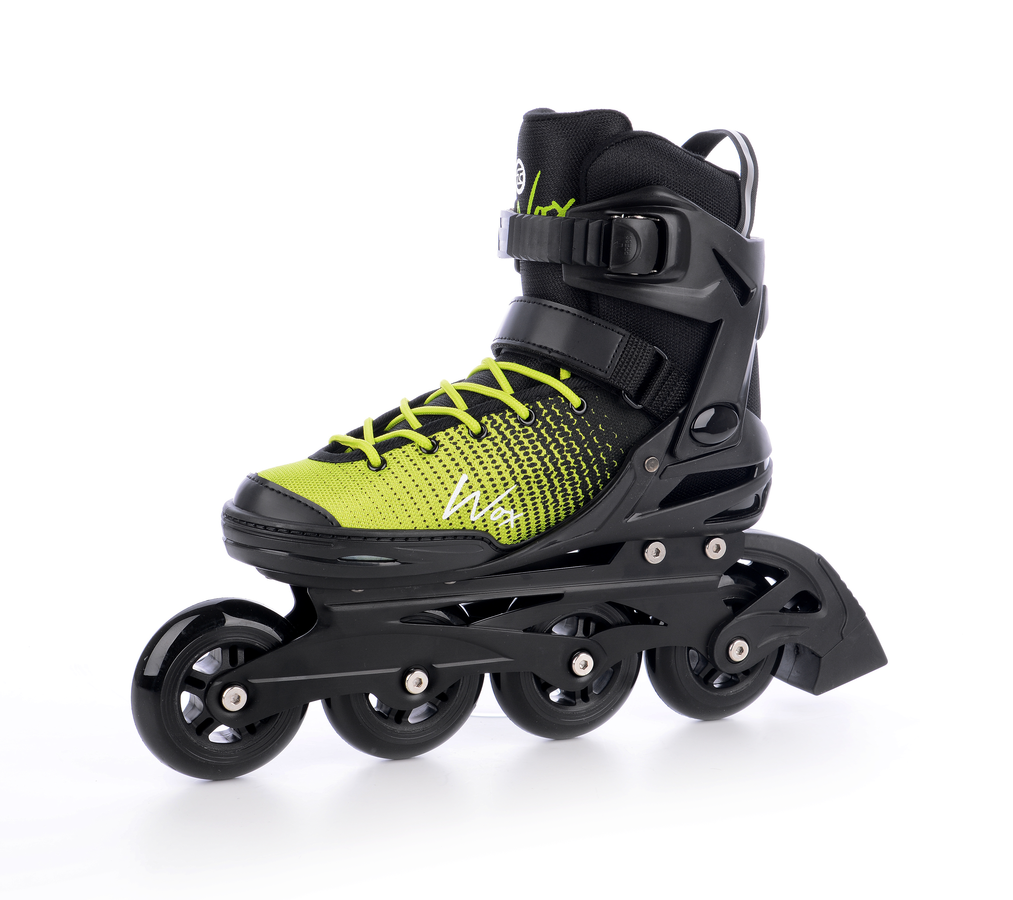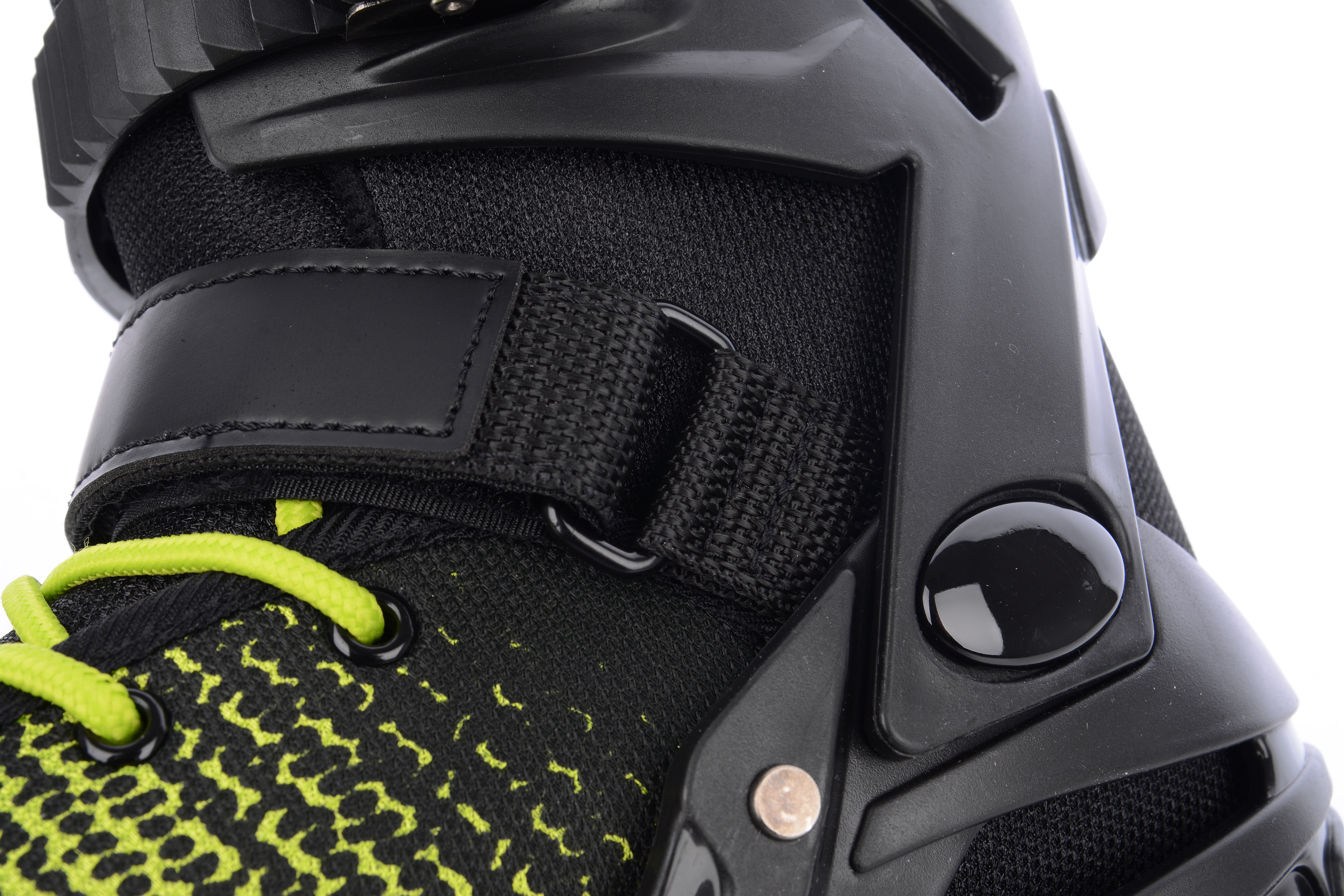 Фіксація черевика на нозі здійснюється за рахунок шнурівки, ременя на липучці, і ременя на авто застібці в зоні гомілки. Все разом це гарантує надійне утримання роликів на ногах без ризику зісковзувань. У задній частині, для комфорту, є петля. З її допомогою можна надягати і знімати взуття, а також переносити і зберігати. Світловідбиваючі елементи забезпечують додаткову безпеку, роблячи вас помітним в темний час доби.