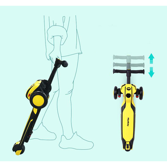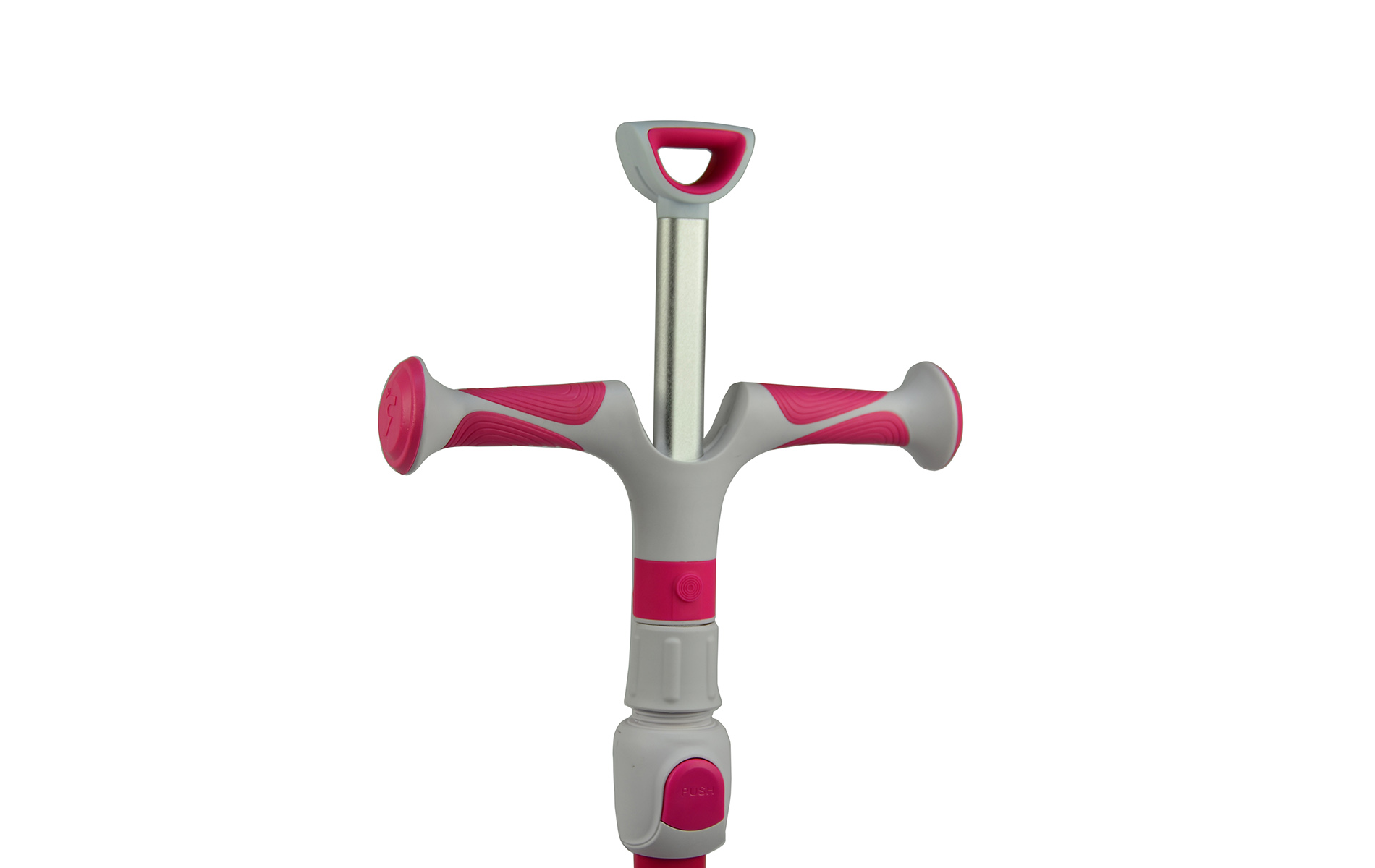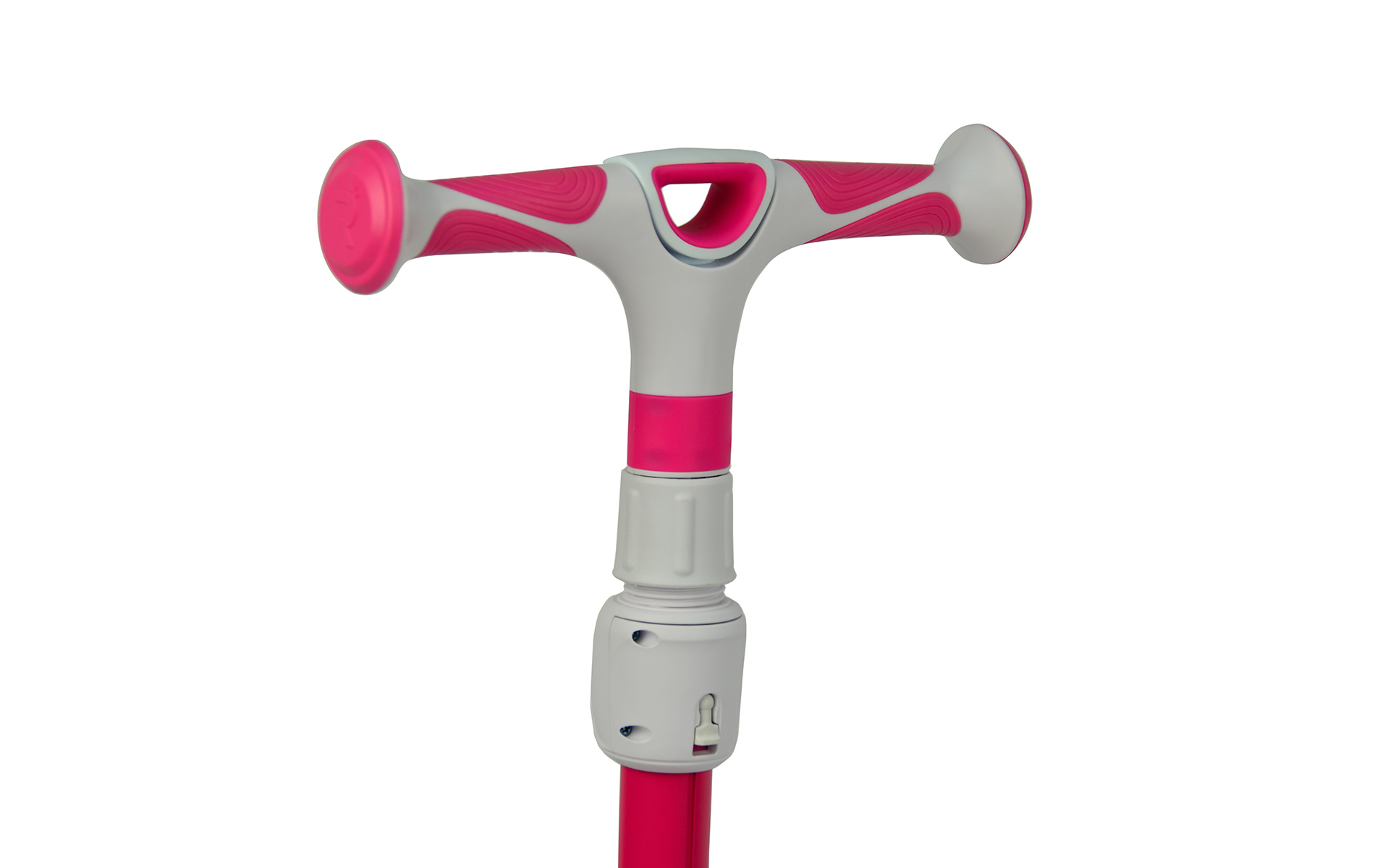 - Самокат легко складається, автоматично фіксується, зручно перевозиться в складеному вигляді за допомогою запатентованої висувної ручки.