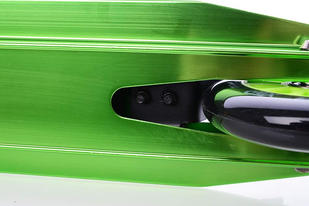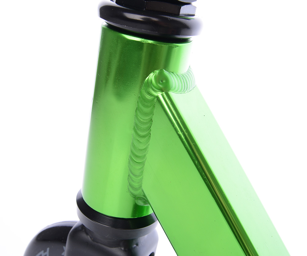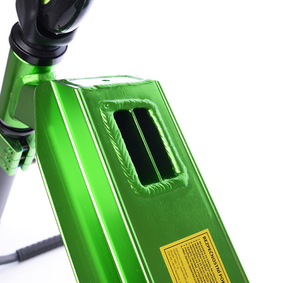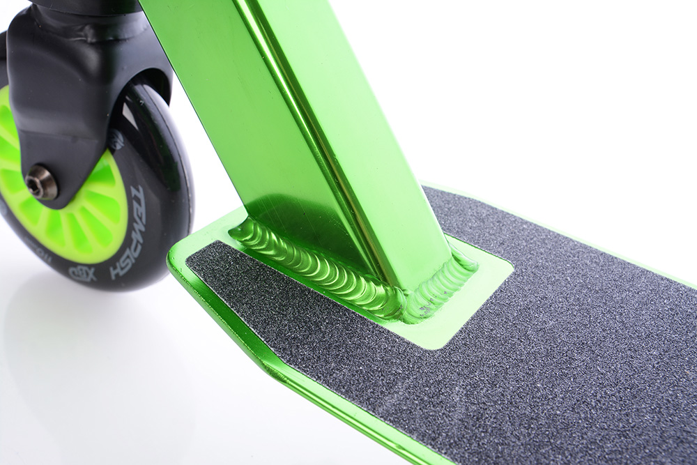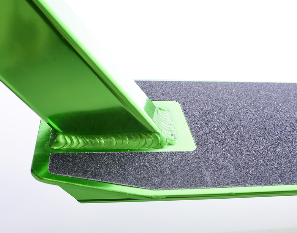Матеріал самоката схильний до елоксації - це вид хіміко-термічної обробки алюмінієвих виробів. Він полягає в створенні на поверхні захисного шару оксиду алюмінію, який більше не окислюється і, таким чином, захищає сам алюміній від окислення.