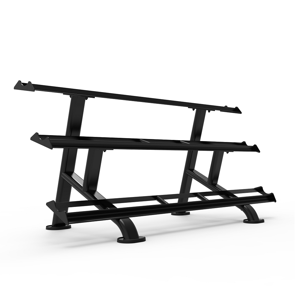- Триярусна конструкція дозволяє розмістити до 15 пар гантелей (по 5 пар на кожному ярусі).