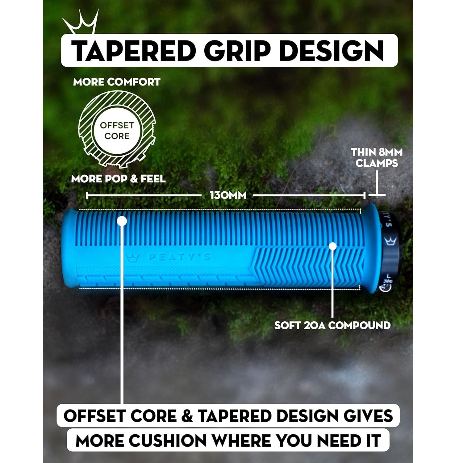 Всі люди різні, як і їхні руки, тому використовувати універсальний підхід до діаметра рукояті майже так само нерозумно, як пропонувати універсальну рукавичку. Тонкі грипси Peaty's мають діаметр 30 мм усередині та 32 мм зовні. Товсті грипси Peaty's мають діаметр 32 мм усередині та 34 мм зовні. Це не тільки робить товсту рукоятку ідеальним діаметром для людей з великими руками, але й додатково забезпечує 2 мм гуми, що амортизує, в порівнянні з тонкою рукояттю.