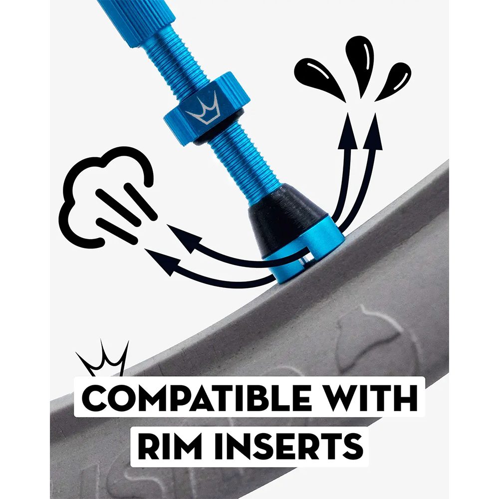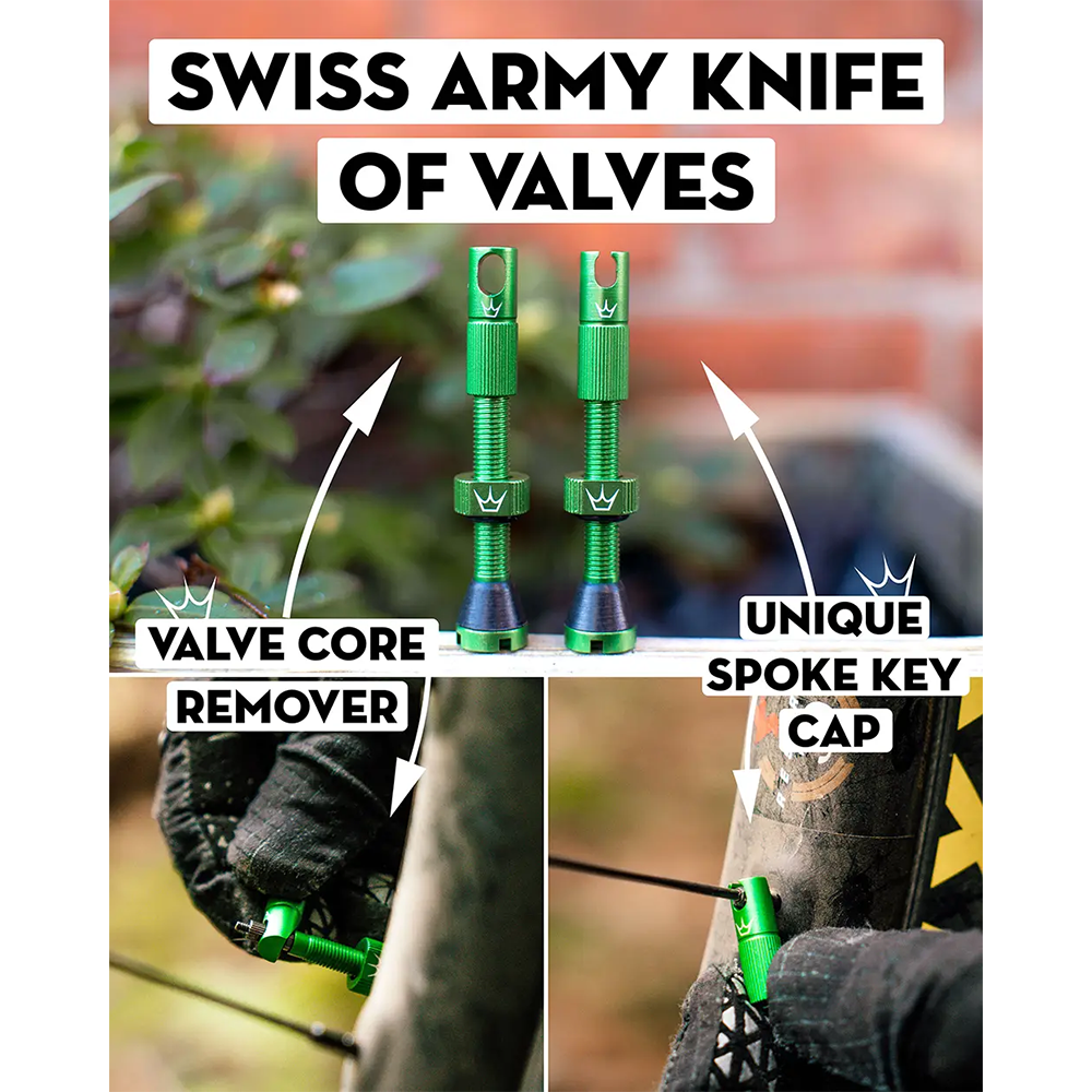 Безкамерні моделі Chris King Vannes Peaty виготовлені з легкого анодованого алюмінію, доступні довжиною 42 мм, 60 мм та 80 мм і підходять для більшості безкамерних дисків, включаючи карбонові, ендуро та DH. Велика м'яка гумова основа легко забезпечує ущільнення герметичного отворів ніпеля діаметром до 8 мм. Вбудовані знімники сердечника ніпеля дозволяють легко зняти ніпель і заповнити його герметиком, коли ви перебуваєте в дорозі.