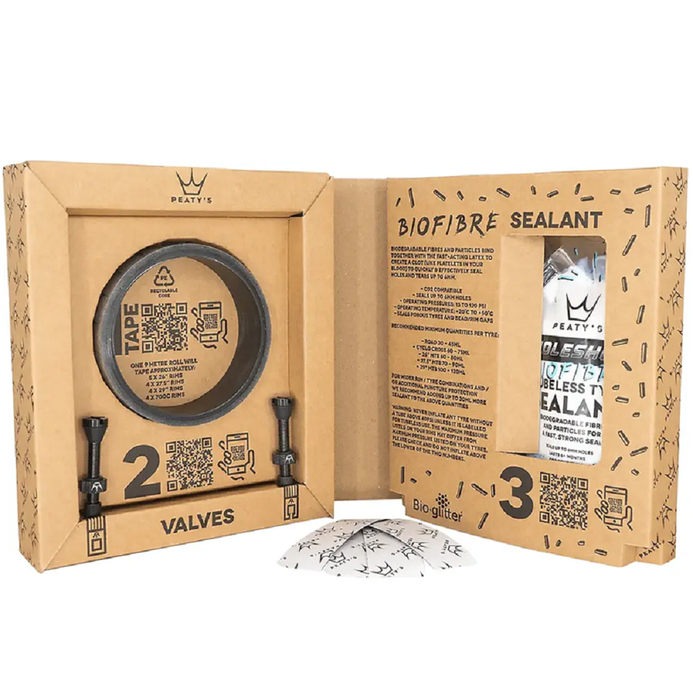 Комплекти для переобладнання безкамерних шин Peaty красиво оформлені та забезпечені простими інструкціями з встановлення. Ці комплекти для переобладнання доступні в різних конфігураціях, тому можна кататися з ідеальною безкамерною установкою в будь-якій дисципліні: Road, Gravel, XC, Enduro, Downhil. На упаковці кожного комплекту є зручний посібник із встановлення з QR-посиланнями на покрокову установку на кожному етапі установки - процес установки буде простим і швидким.